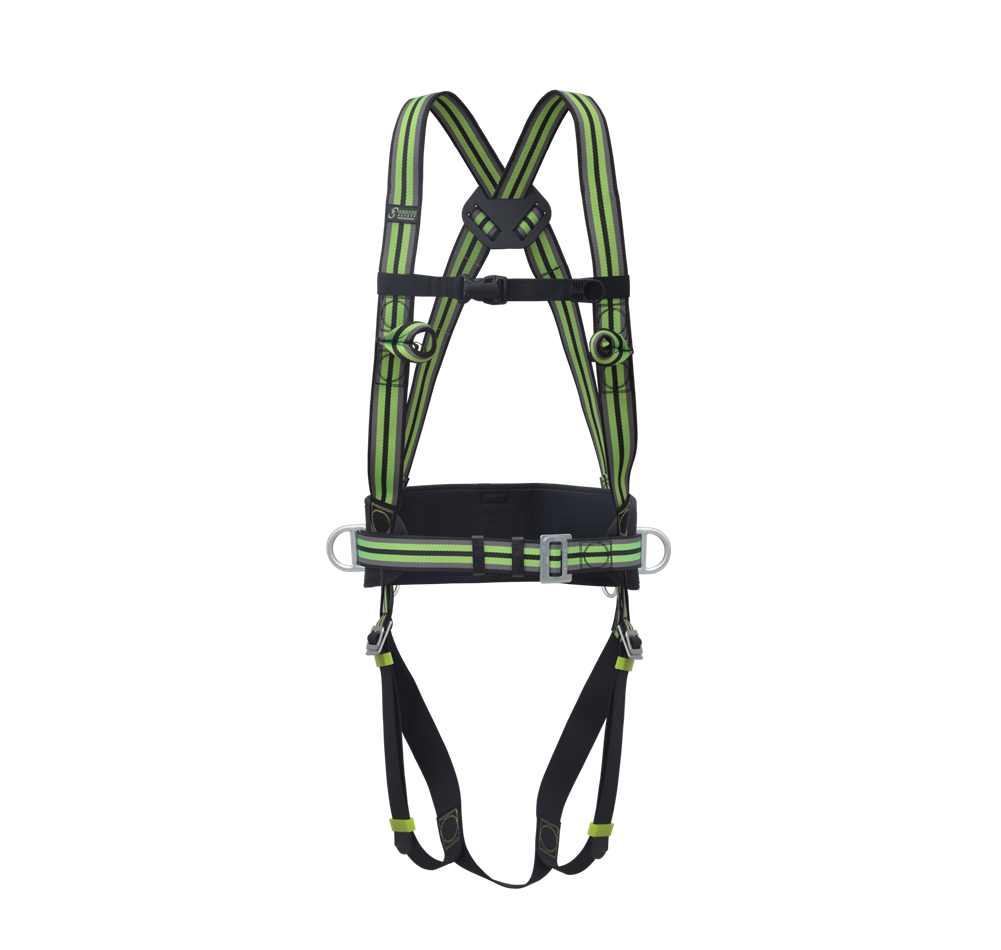 2 rindmises osas olevat tekstiilsilmust ja seljal D-kujuline kinnitus kukkumiskaitse jaoks.